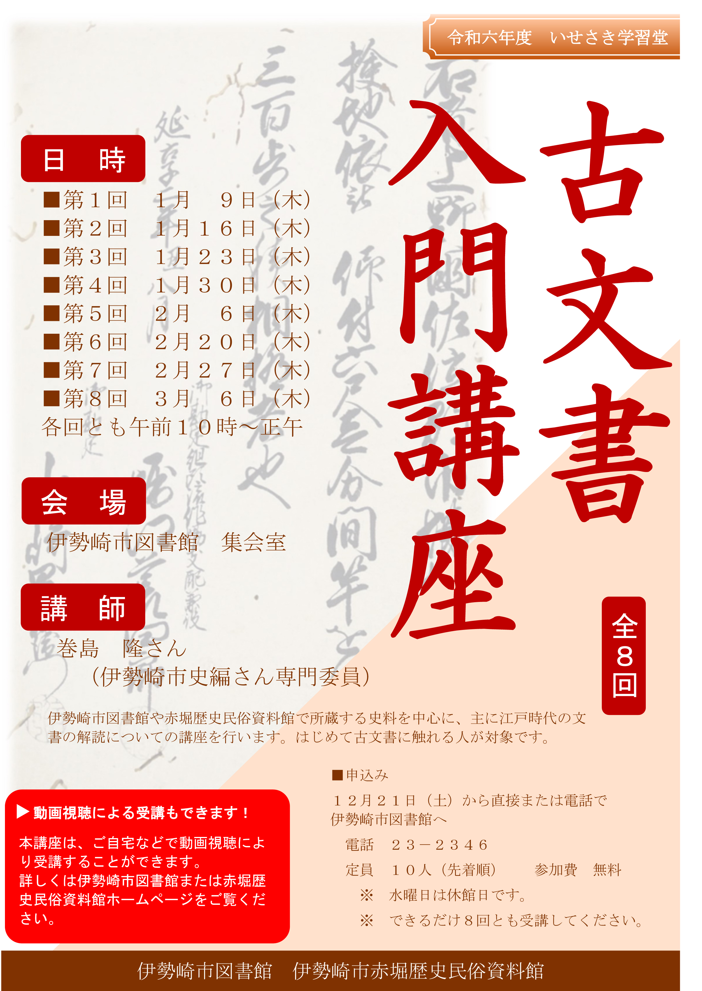 いせさき学習堂「全8回古文書入門講座」